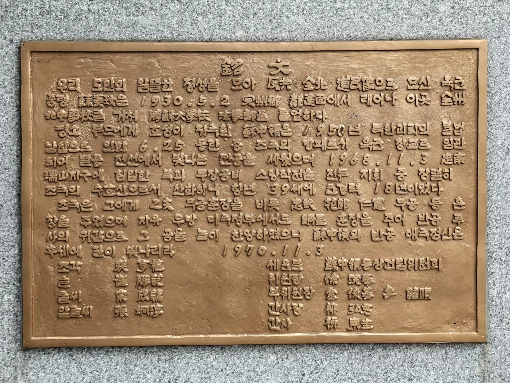 평소 부모에게 효성이 지극한 소중령은 1950년 북한괴뢰의 불법 남침으로 인한 6.25 동란 중 조국의 방패로서 육군 장교로 임관되어 멸공전선에서 빛나는 전공을 세웠으며 1968.11.3 충남서산지구에 침입한 북괴 무장공비 소탕작전을 진두 지휘하던 중 장렬히 조국의 수호신으로서 산화하니 향년 39세에 군경력 18년이었다